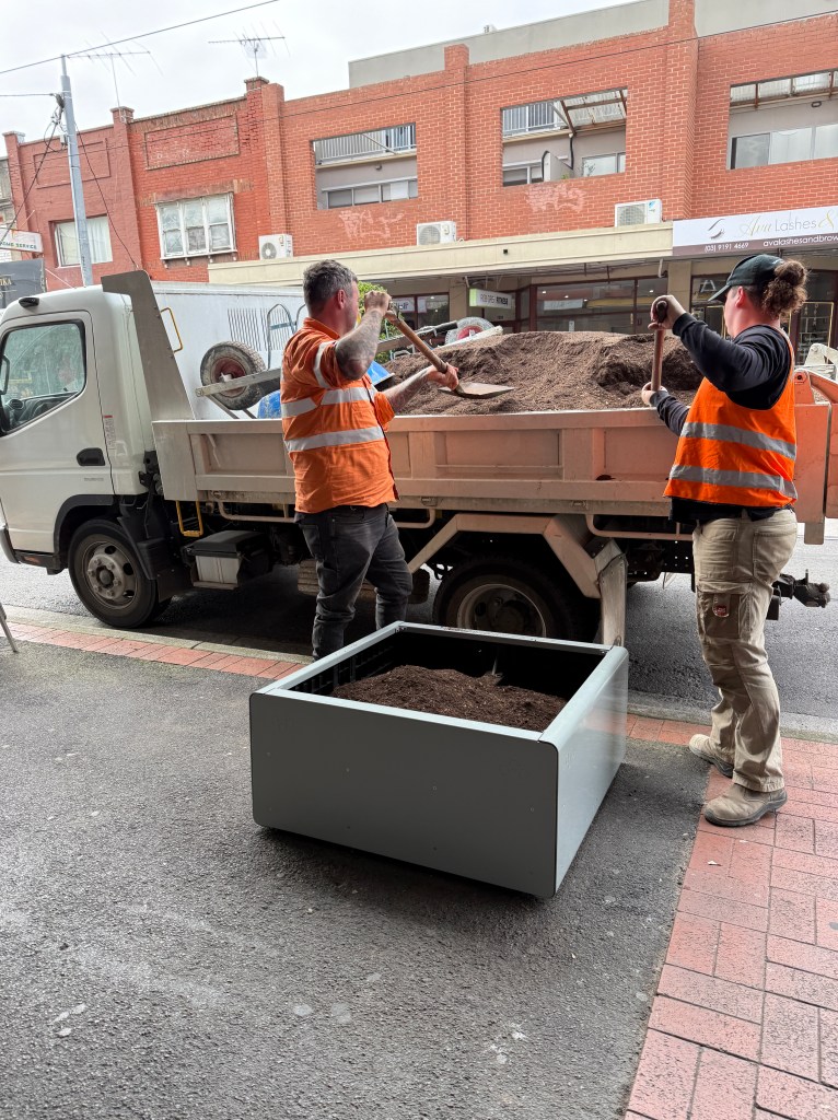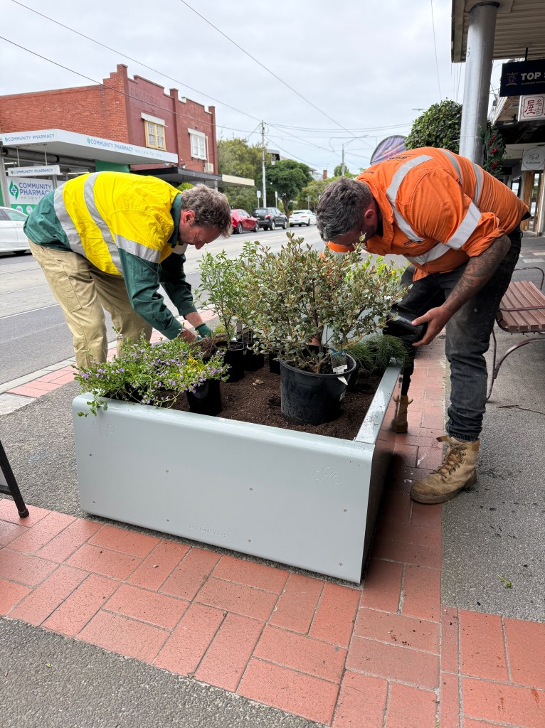 Installation of custom planter boxes along Centre Road for Glen Eira City Council, enhancing the streetscape with new greenery while working safely within a busy retail environment.